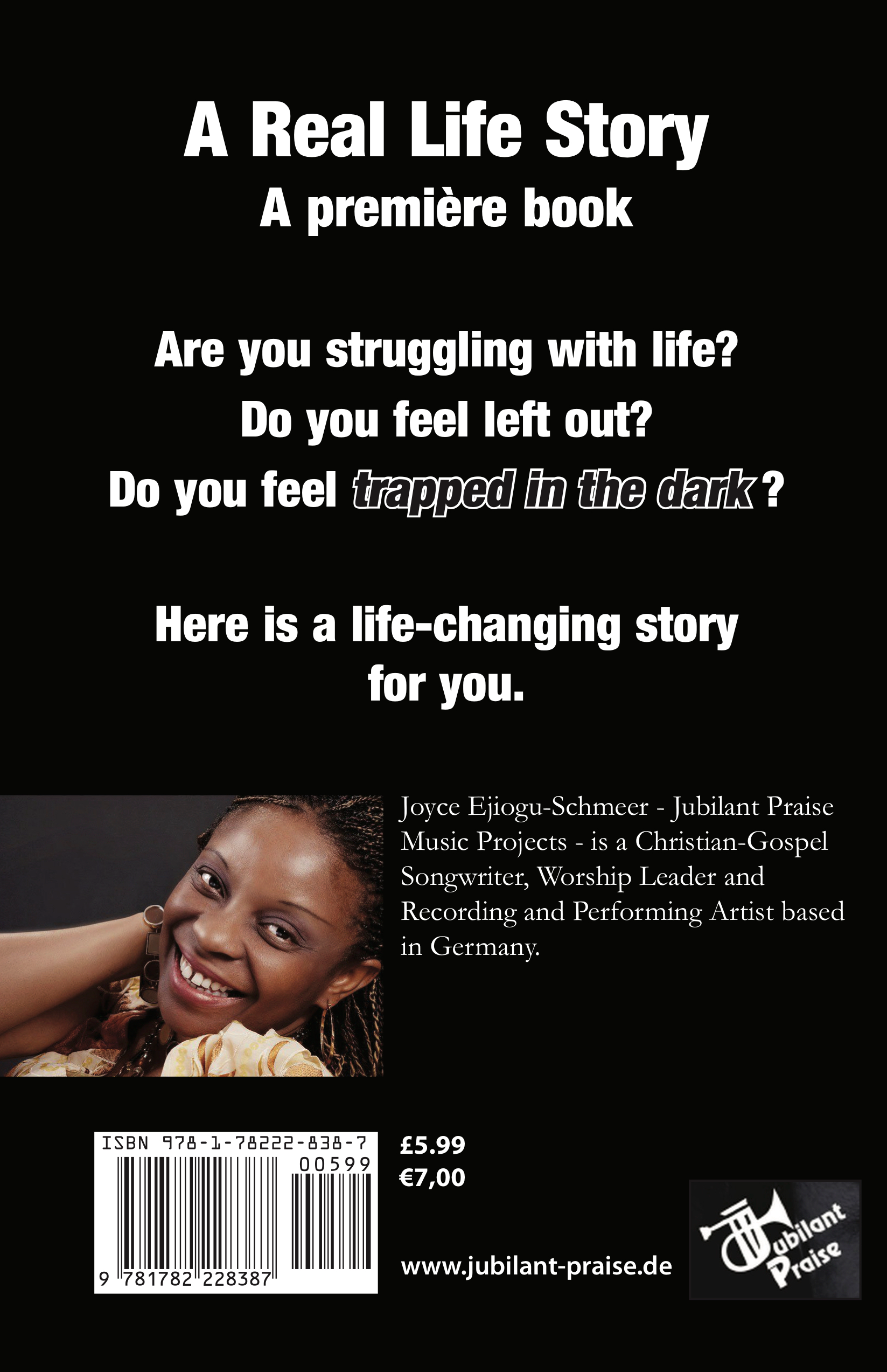 Trapped in the Dark by Joyce Ejiogu-Schmeer, ISBN 978-1-78222-838-7 is available in book stores and sales depots. Online purchase can be made from her website www.jubilant-praise.de Amazon, Google book, Ebay, and many others.